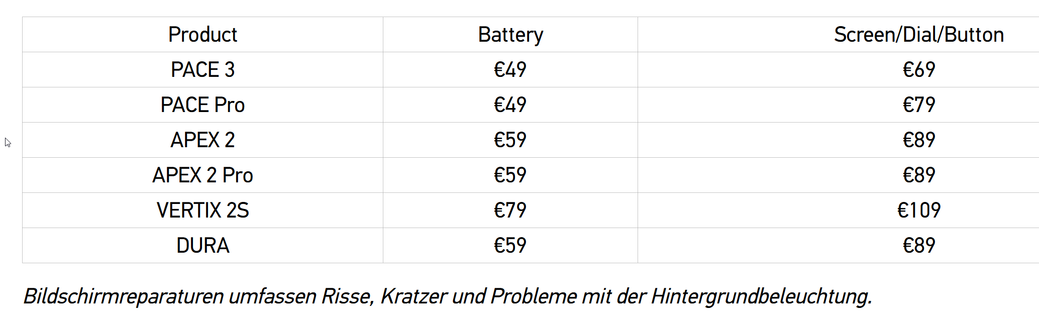 Die Reparaturkosten variieren je nach Modell und Art des Schadens. Grundsätzlich unterscheidet COROS zwischen Akku-Tausch und Display/Tasten-Reparatur.