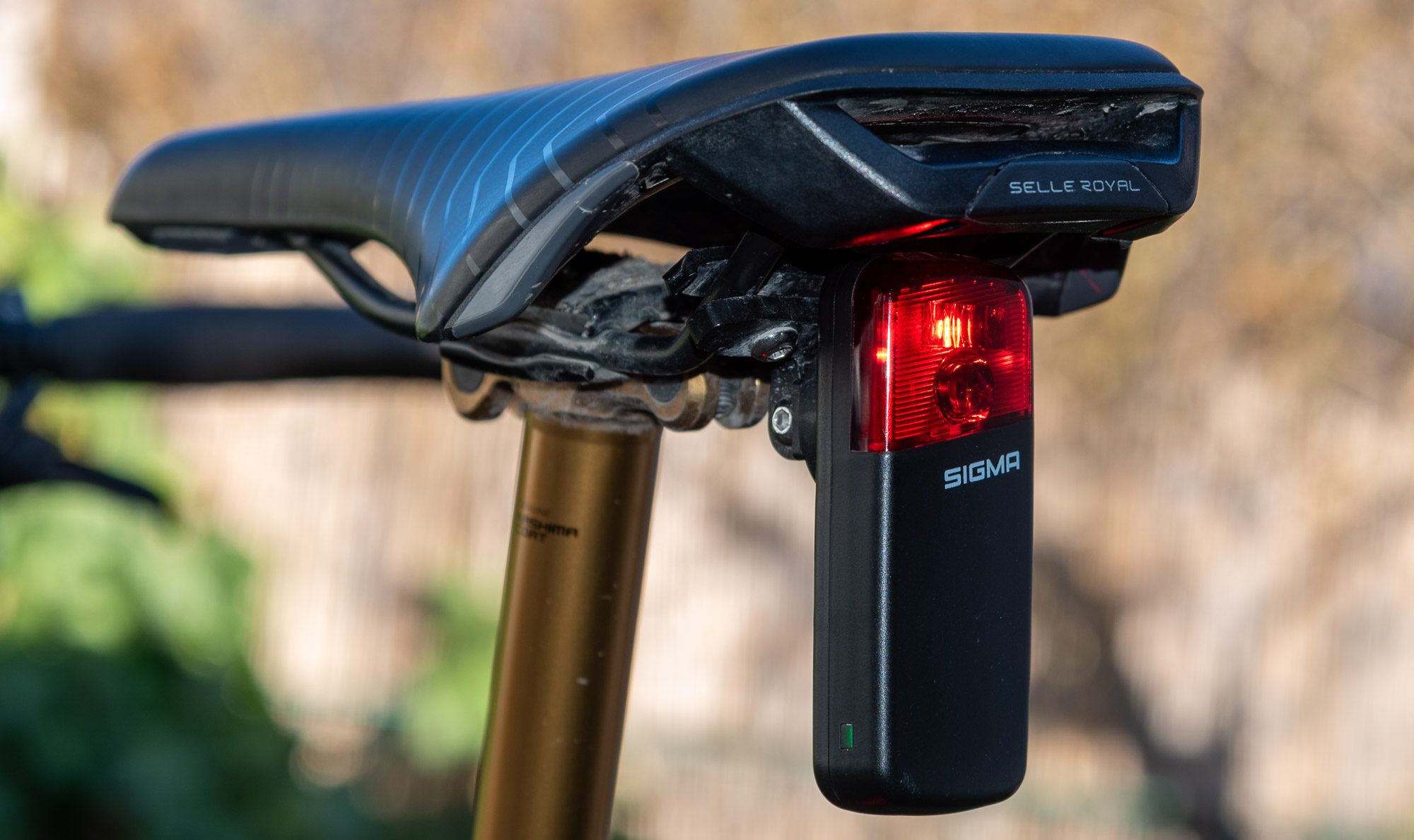 Sigma legt Befestigungsmaterial für Sattelstangen in rund, D-Form und Aero-Design bei. An der Sattelstange wird per Gummiband befestigt.