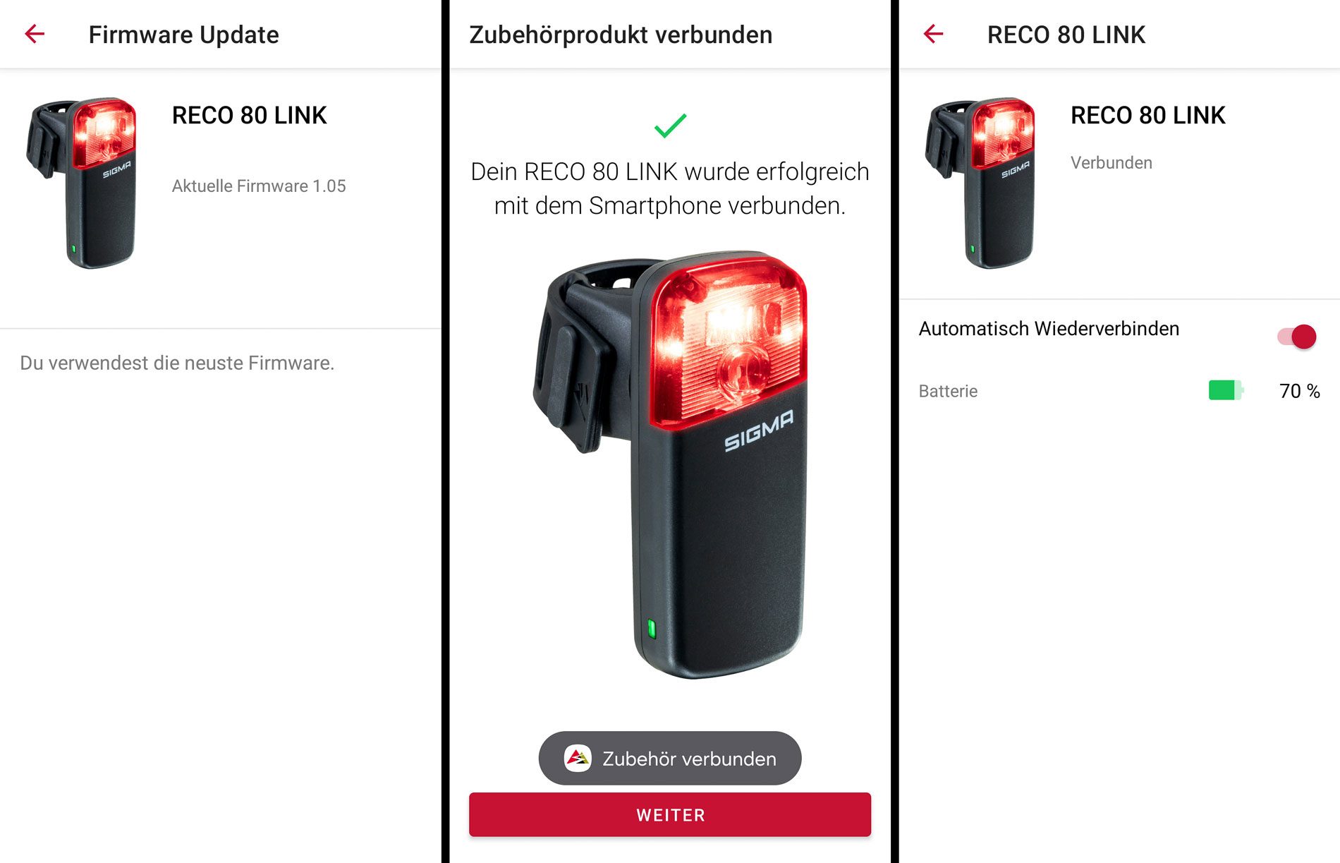 Den aktuellen Akkustand siehst du über die Status LED an der Seite oder Prozent genau in der Sigma Ride App.